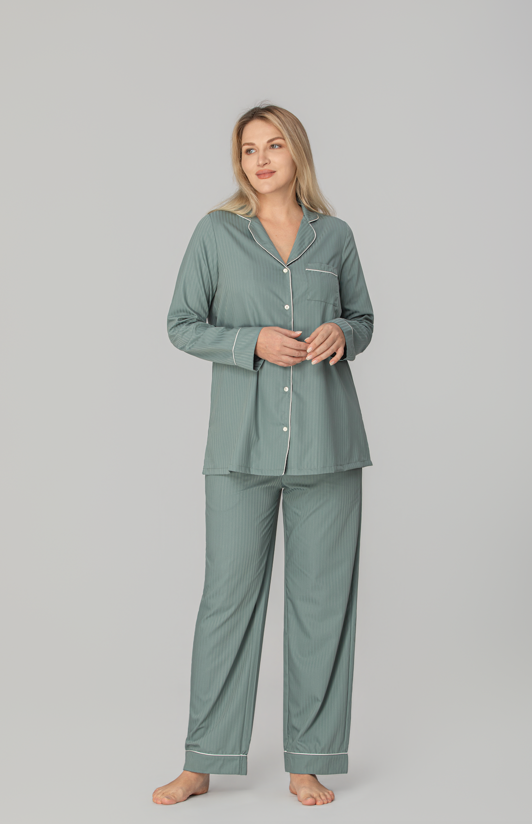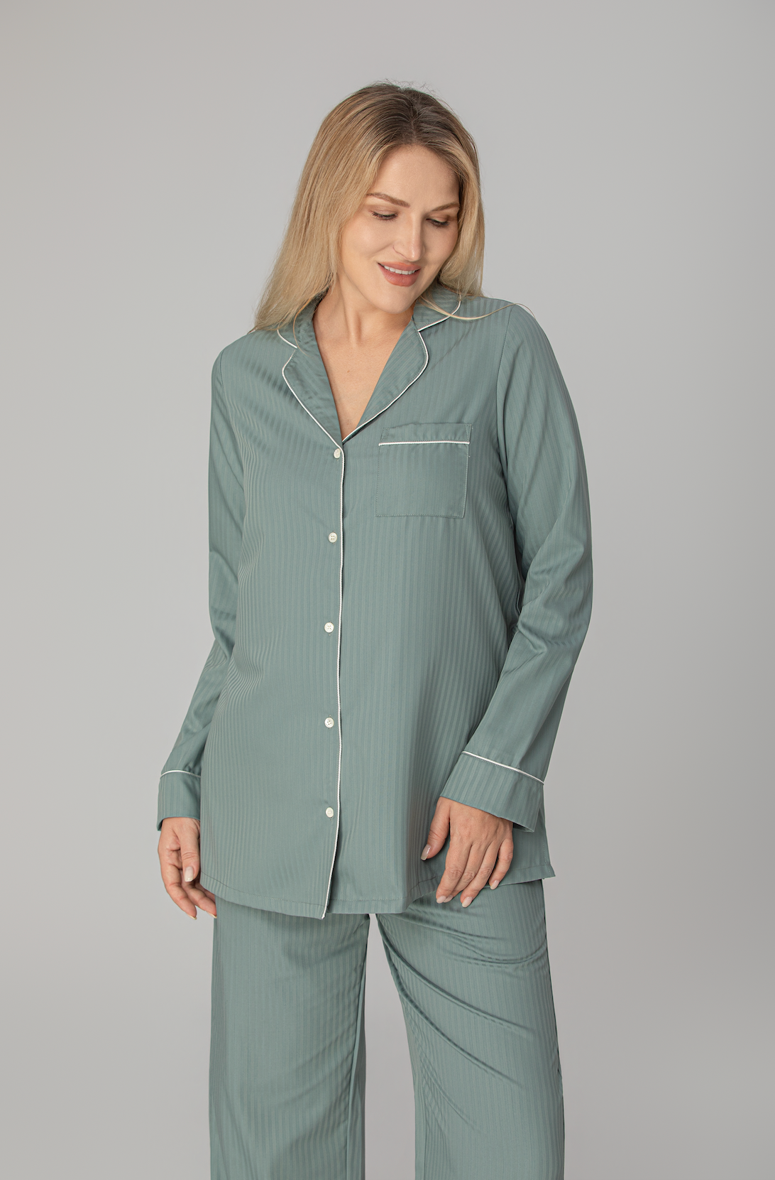 Med en loose fit og myk fleksibilitet følger pyjamasen kroppens naturlige bevegelser. Den gir full bevegelsesfrihet og en avslappet følelse, enten du sover, hviler eller beveger deg rolig gjennom morgenrutinen.